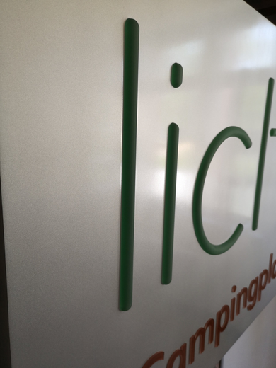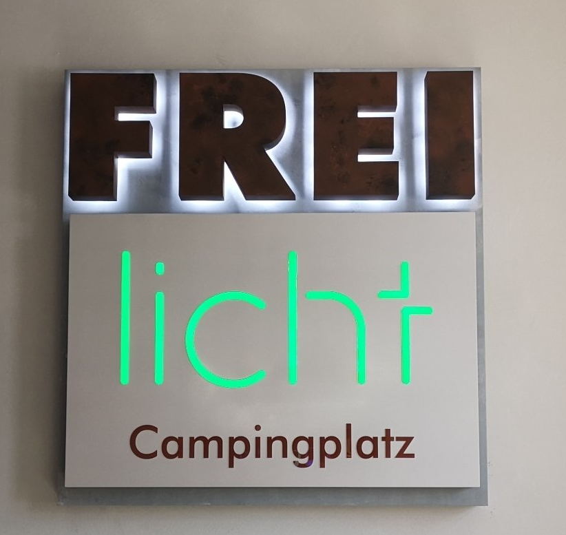 Aufgabe in der praktischen Meisterprüfung war es,eine beleuchtete Außenwerbeanlage zum Thema „Urlaub“ zu entwerfen. Katharina Knabe entschied sich für einen modernen Campingplatz mit dem Namen FreiLicht. Highlight sollte das Wort ‘‘licht‘‘ in einer Neonoptik sein, welches sie durch abgerundete und matt geschliffene Acrylglasbuchstaben schaffte. Das Wort ‘‘Frei‘‘ wurde aus PVC-Hartschaum hergestellt und in Rostoptik lackiert.